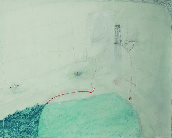 住んでいた家のバスルームを描きました。 モチーフは実家のバスルームですがもう何年も実際に見ていないので、ぼんやりした記憶の中で自分によって強調されている部分や、よく覚えていること、人の気配や水の気配を表現しようと制作しました。