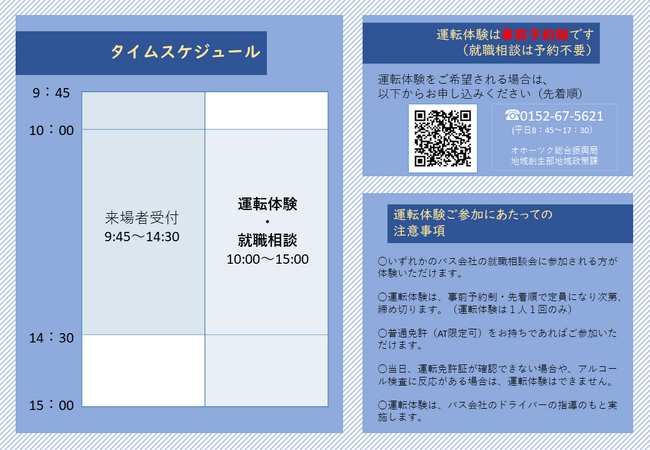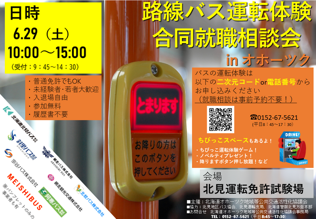 近年の人口減少や少子高齢化の進展等を背景として、バス運転手の不足と高齢化が業界全体の喫緊の課題となっていますが、バスは地域住民のみならず、観光客にとっても必要不可欠な交通手段であることから、その維持に向けた取組として、「路線バス運転体験・合同就職相談会 in オホーツク」を開催します。