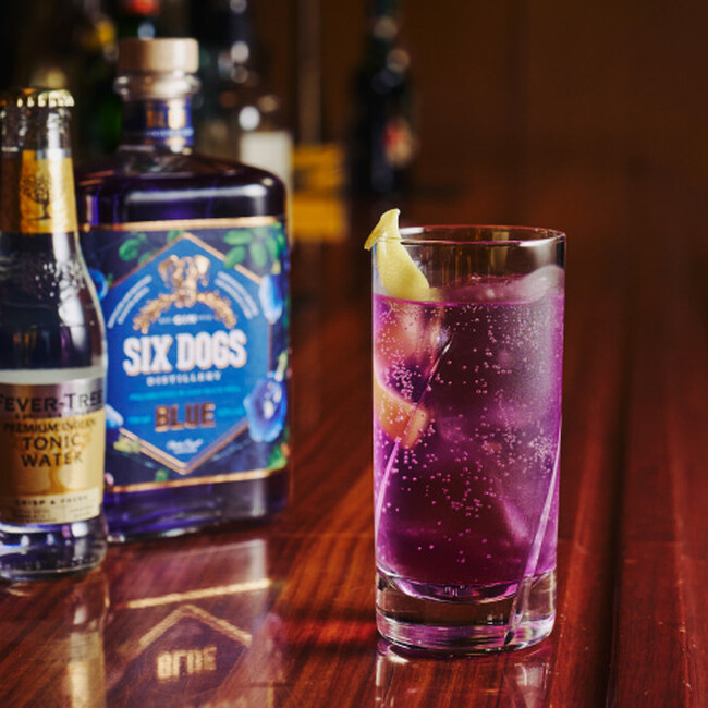 バタフライピーの花びらからつくられる鮮やかな青色のクラフトジン「シックス・ドッグス ブルージン」と、コクのある苦みと優しい甘味が特徴の「フィーバーツリー トニックウォーター」を合わせたプレミアムなジントニック。ブランドカラーの紫色に仕上げました。