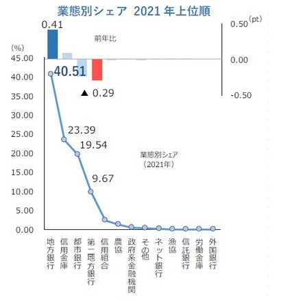 業態別にみると、シェアが最も高いのは「地方銀行」で40.51%となり、全業態のなかでは唯一3年連続で4割を超えた