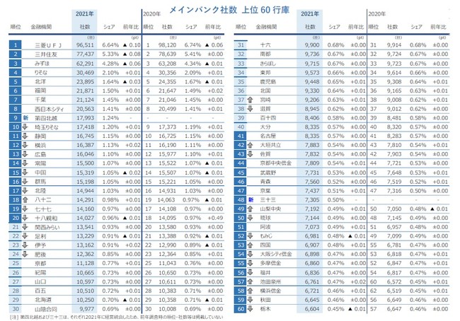 2021年の全国メインバンク社数トップは「三菱UFJ銀行」となった。企業数は9万6511社となり、2009年の調査開始以降13年連続のトップ。ただ、都市銀行(メガ)上位3行のメイン社数は昨年比で計約3700社、シェアにして計0.24ptの減少となり、メイン社数の減少が進んでいる。地方・第二地方銀行では、上位60行のうち「北洋銀行」(2万3895社)が最多。「第四北越銀行」のメイン社数は1万7993社(シェア1.24%)で、北陸4県に拠点を置く地方銀行として初めて上位10行入りした