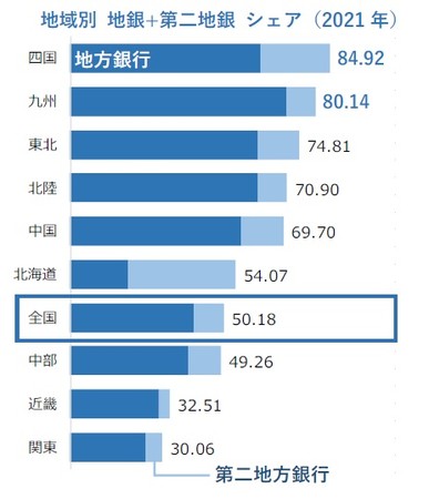 地域別:「地方銀行」トップシェア、6地域に拡大 九州は地銀シェア7割超に