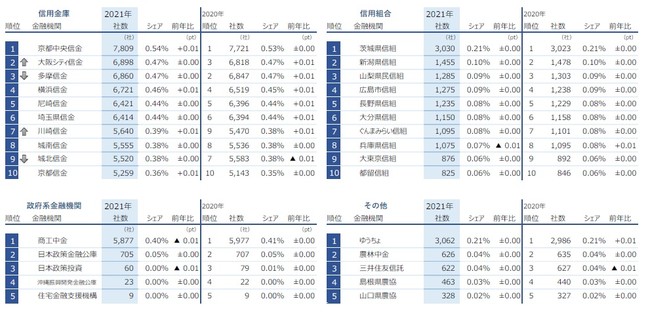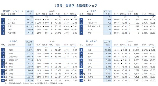 実店舗を持たずインターネットバンキングなどオンラインでの金融事業を主力事業とする「ネット銀行(新形態の銀行)」も、少数ながらシェアの拡大が続いている。ネット銀行のシェアは0.14%(前年比+0.01pt)となり、調査当初の2009年(シェア0.01%)から14倍に拡大した。特に「住信SBIネット銀行」「楽天銀行」などをメインとする企業が増えており、両行を中心にネット銀行全体のシェアを押し上げている。地域単位・県単位で拠点の集約化が続いている「農協」(シェア1.23%)や「漁協」(同0.08%)でもシェアが拡大、農協では2009年からのシェア拡大幅が地方銀行に次いで大きい。