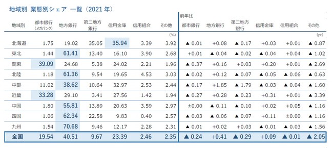 地域ごとに業態別のシェアをみると、9地域中6地域で「地方銀行」がトップシェアとなり、うち5地域では過半数を占めた。また、北陸や中部、九州など6地域ではいずれも地方銀行の地域シェアが拡大したが、東北と中国、四国では縮小した。九州は引き続き、全国で唯一となる地方銀行のシェア7割を有し、第二地方銀行も含めると地銀勢における九州のシェアは80%を超える。これは四国の同シェア(84.92%)に次いで高い水準となっている。