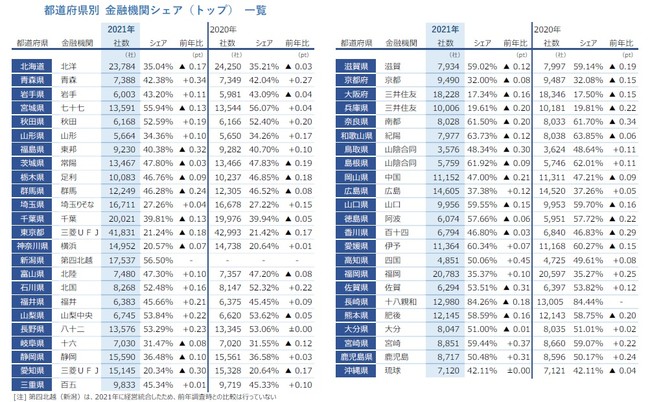 このほか、前年からシェアを拡大させたのは17、低下したのは29。最もシェアが拡大したのは「高知県」の四国銀行(前年比+0.45pt)。最も縮小させたのは「福島県」の東邦銀行(前年比▲0.32pt)となっている。