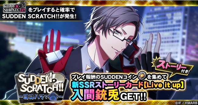 イベント期間中、KILLER SCRATCH!!をプレイするとライズ消費量に応じた確率でSUDDEN SCRATCH!!が発生します。SUDDEN SCRATCH!!をプレイすると、通常の報酬アイテムの他、限定アイテム「SUDDENコイン」を獲得することができます。「SUDDENコイン」を集めることで、ストーリーカードSSR【Live it up】入間銃兎と交換することが可能です。詳細はアプリ内お知らせをご確認ください。