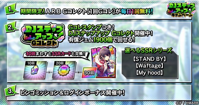 期間中A.R.B Gコレクトの[1回Gコレ]を1日1回、無料で回すことができるほかに、ビンゴミッションやログインボーナス、ライズ回復時間1/2キャンペーンなどを開催しています。詳細はアプリ内お知らせをご確認ください。