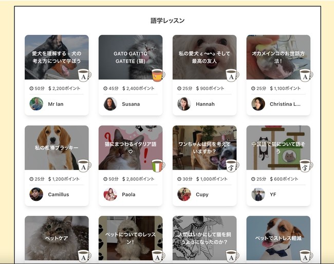 語学レッスンは、英語、スペイン語、中国語、イタリア語などさまざまな言語でペットについてお話しするレッスンが揃っています。