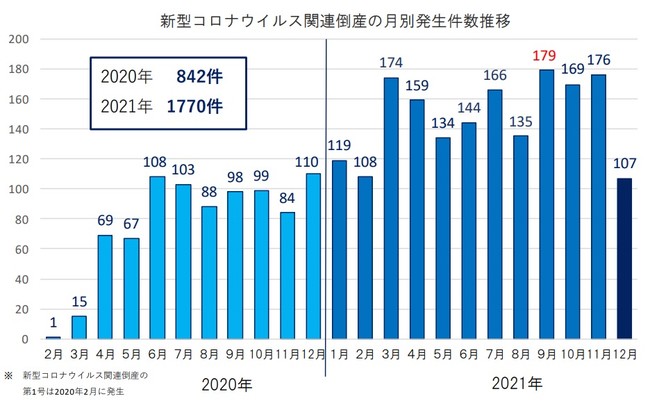 2021年12月29日15時現在、新型コロナウイルスの影響を受けた倒産〈法的整理または事業停止(銀行取引停止処分は対象外)、負債1000万円未満および個人事業者を含む〉は、全国に2612件(法的整理2426件、事業停止186件)確認されている。そのうち2021年に発生したのは1770件で、2020年(842件)の2.1倍となっている。