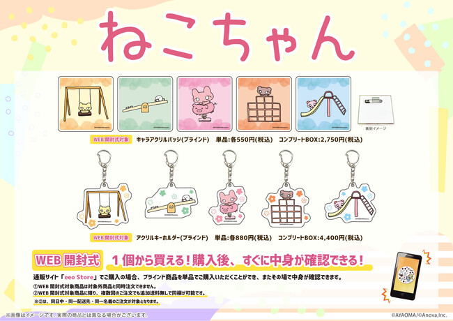 縦横最大6.5cmのアクリルキーホルダーがラインナップ。カバンや鍵につければ、キュートなワンポイントになるほか、『ねこちゃん』たちに癒されること間違いなしです。
