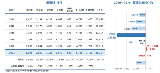 2021年に全国で休業・廃業、解散を行った企業(個人事業主を含む)は前年から約1400件(2.5%)減少の5万4709件を数えた。2021年初頭から3.76%の企業が、休廃業などの形で同年中に市場から退出・消滅した。20年に続き2年連続で減少し、コロナ前の19年からは4000件超の大幅減少となったものの、減少率は大幅に縮小した。