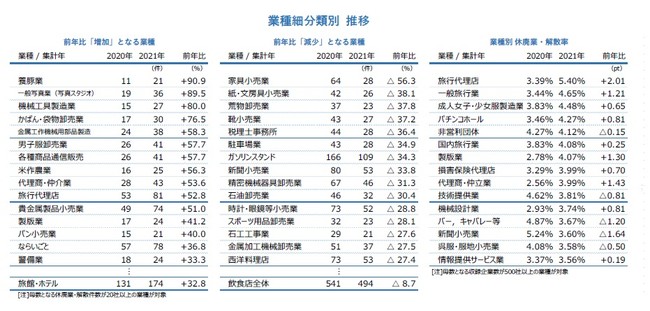 休廃業・解散率では、最も高いのが旅行代理店で5.40%となり、2020年の3.39%を大きく上回る水準となった。「一般旅行業」(3.44%→4.65%)、「国内旅行業」(3.83%→4.08%)を含め、旅行産業の休廃業・解散率が急激に高まった。