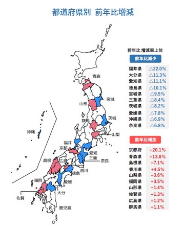 一方、「京都府」や「青森県」など13の都道府県では前年を上回った。なかでも京都府は全国で唯一の2割増となったほか、青森県も1割超の増加となった。両府県ともに、件数が減少した20年の反動増とみられる。