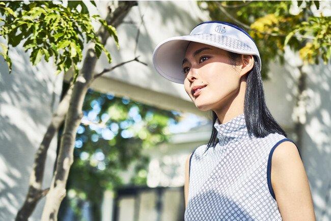 2023年春夏シーズンのデザインテーマは『RETREAT LUXURY(リトリート ラグジュアリー)』です。カラーは、ホワイトとネイビーを基調に、ヒューマンフィーリングを象徴するピンクをサブカラーとして採用しています。また、デザインは、ゴルフボールのディンプルをイメージしたドット柄やフラワーモチーフを採用することで、爽やかでスポーティな大人のつや感を出しています。