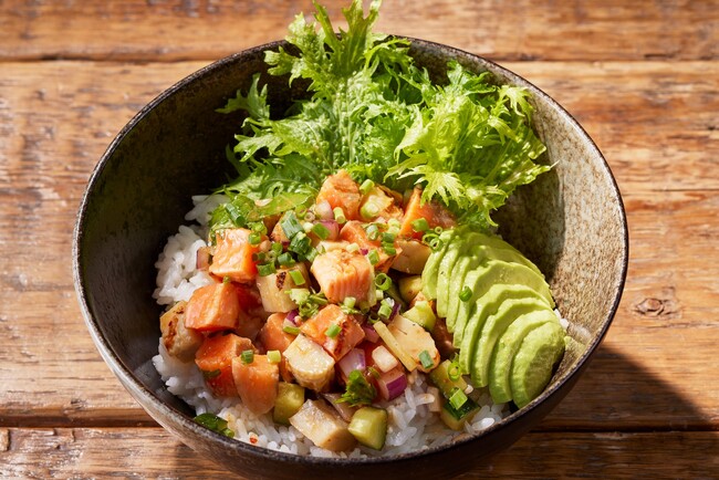 仙台みそをベースにした特製ダレで、LAVAROCK風に軽くグリルした宮城サーモン、仙台笹かまぼこ、仙台せりを合わせ、アボカドやキュウリ、万能ねぎなどで華やかにあしらい、炊き立ての宮城のブランド米「だて正夢」に乗せたオリジナルのポケボウルです。