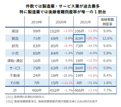 業種別では製造業・サービス業が過去最多 「後継者難倒産率」は製造業が唯一の1割超