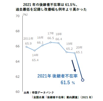 一方で、明るい兆しも見え始めている。帝国データバンクの調査では2021年の後継者不在率は61.5%となり、依然として6割台と高水準にあるものの4年連続で低下し、調査を開始した2011年以降で最低となった。改善幅も3.6ptと大きく改善し、後継者不在の状況は徐々に快方に向かっている結果が表れた。