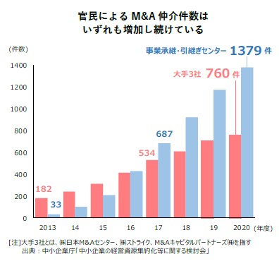 また、国内企業のM&A実施件数は増加傾向にある。(株)日本M&Aセンター、(株)ストライク、M&Aキャピタルパートナーズ(株)の中小企業M&A仲介大手3社による国内M&A実施件数は、2013年の182社から2020年には760社まで増加。また、事業承継・引継ぎ支援センターにおける件数も同33件から1379件となり、右肩上がりで増加している。