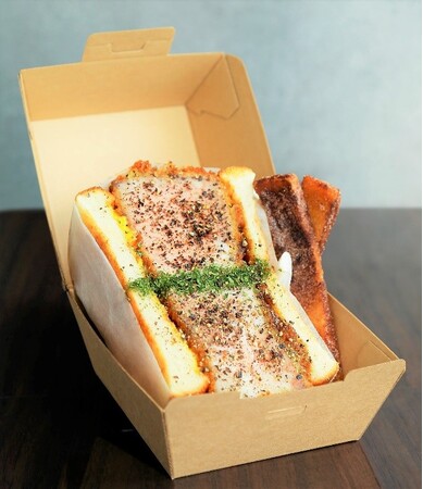 肉の厚さは約5cm!2022年11月のオープン以来連日大行列の人気店。低温調理でジューシーに仕上げた豚肉をザクザクのパン粉で揚げ、もちもち食パンとトマトソースでサンドしたかつサンドです。