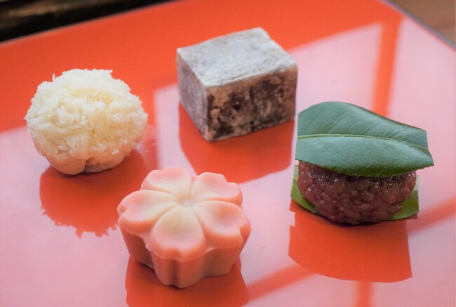 (葛焼き、百合根きんとん、椿餅、桜の練り切り型押し)
