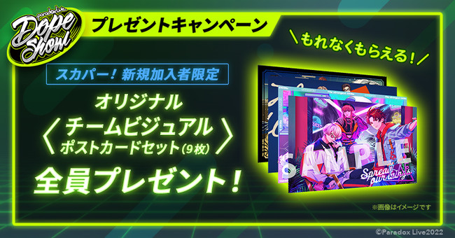 今回の放送を記念して、スカパー!でアニマックスを新規ご契約された方に、Paradox Liveオリジナル<チームビジュアルポストカードセット>(9枚)をもれなくプレゼント!