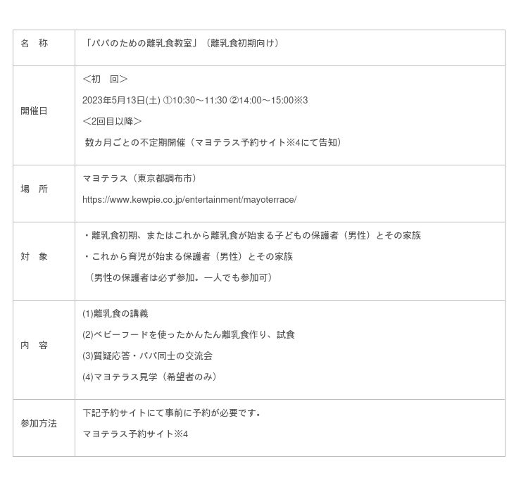 キユーピー株式会社(本社:東京都渋谷区、代表取締役 社長執行役員:高宮 満、以下キユーピー)は、一般のお客さまを対象にした食育プログラム「パパのための離乳食教室」を、5月13日(土)にキユーピーの見学施設「マヨテラス」(東京都調布市)で初開催します。