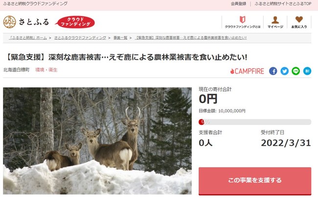 事業名:【緊急支援】深刻な鹿害被害…えぞ鹿による農林業被害を食い止めたい!