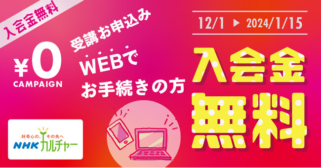 キャンペーン期間中(12/1〜1/15)にホームページからお手続き頂くとNHKカルチャーの入会金(通常5,500円)が無料になります。