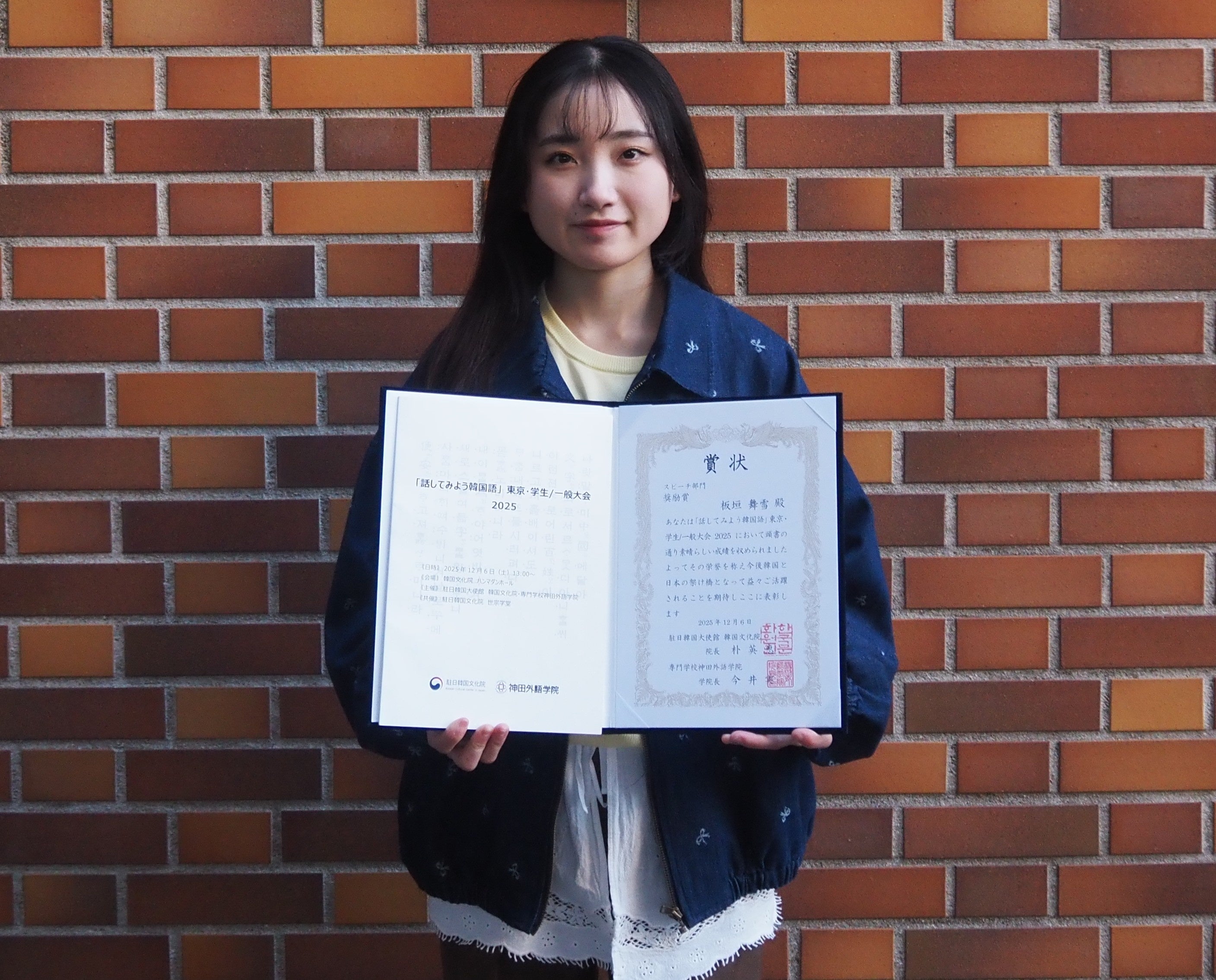 板垣さんはこれまで、韓国語学習歴わずか1年で同大会<スキット部門>『優秀賞』(2021年)を受賞、2022年には韓国・光云大学への1年間留学を経験。2023年には韓国語能力試験(TOPIK)最上級6級を取得するなど、在学期間中に着実に語学力を積み上げてきました。卒業年次となる今年は、自由テーマでスピーチに臨み、発音・表現(50点)/内容・構成(40点)/暗唱(10点)に基づく審査でその語学力が高く評価されました。