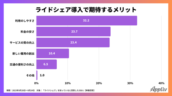 ライドシェアが導入されたら、どのようなメリットを期待するか調べた結果、1位は「利用のしやすさ(32.2%)」、次いで「料金の安さ(23.7%)」でした。