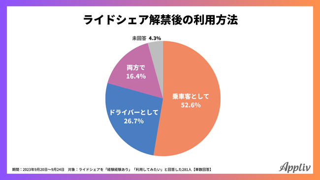 ナイル株式会社(本社:東京都品川区、 代表取締役社長:高橋飛翔、 以下ナイル)が運営するスマートフォンユーザー向けアプリ情報メディア「Appliv(アプリヴ)」にて、20代〜60代男女463人を対象に、2023年9月20日〜9月24日の期間で、ライドシェアに関するアンケート調査を実施しました。