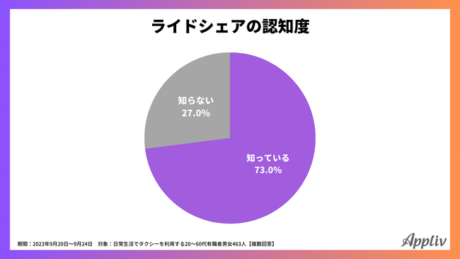 続いて、「ライドシェア」を知っているかを聞いてみると、「知っている(73.0%)」、「知らない(27.0%)と、認知率は7割を超えていることが分かりました。