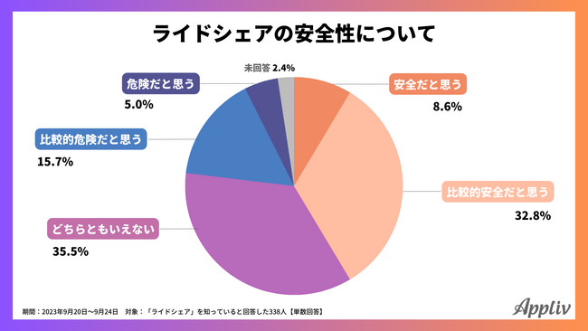 ライドシェアの安全性についてどう思うか意見を尋ねてみると、中立的な人が35.5%と最も多い結果となりました。