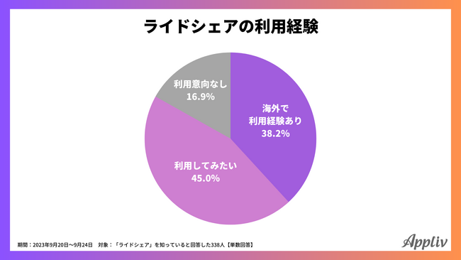 「ライドシェア」を知っていると回答した338人の利用経験を調べたところ、38.2%が海外で利用したことがあると回答。