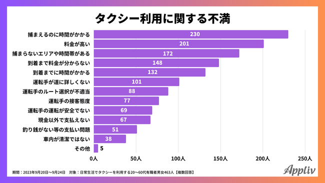 日常生活でタクシーを利用する会社員463人に対し、 タクシー利用に関する不満を尋ねたところ、「捕まえるのに時間がかかる(230人)が最も多く、全体の約半数を占める結果でした。