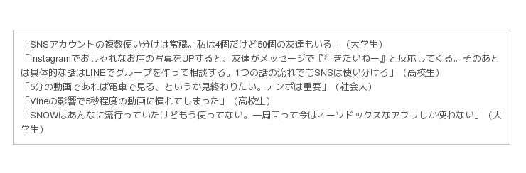 しかし、スマホネイティブ(スマホが普及している環境で生まれ育った世代)であるイマドキ女子のスマホの使い方は、他の世代と感覚が違うようです。一年前(2017年7月)のものですが、それが端的に表れているインタビューの声をご紹介します。