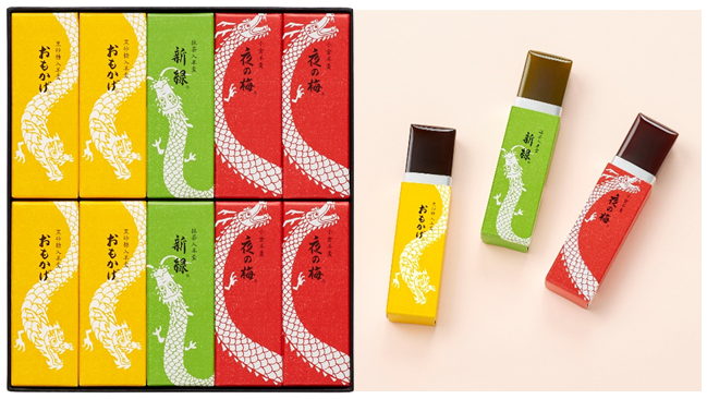 2024年の干支「辰」を描いた期間限定パッケージの小形羊羹です。穏やかな新年をゆったりとお過ごしいただきたいという思いを込めて、大空を舞う龍の姿を配しました。干支パッケージ小形羊羹「夜の梅」「おもかげ」各4点、「新緑」2点を詰め合わせました。