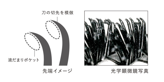 ロングタイプとボリュームタイプ、どちらのマスカラにも、刀の切先(きっさき)のように、繊維毛の先端を鋭利に尖らせカーブ加工を施したブラシ「カタナ切先加工ブラシ」を採用。