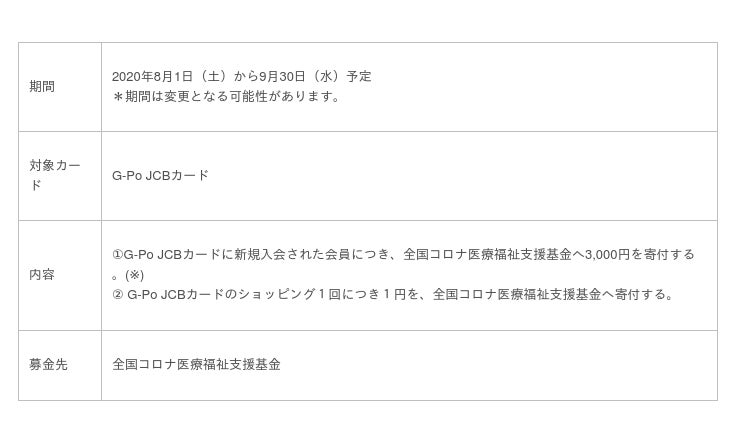 2020年8月1日(土)から、G-Po JCBカードへの新規入会数およびカード利用回数に応じて全国コロナ医療福祉支援基金へ寄付をいたします。