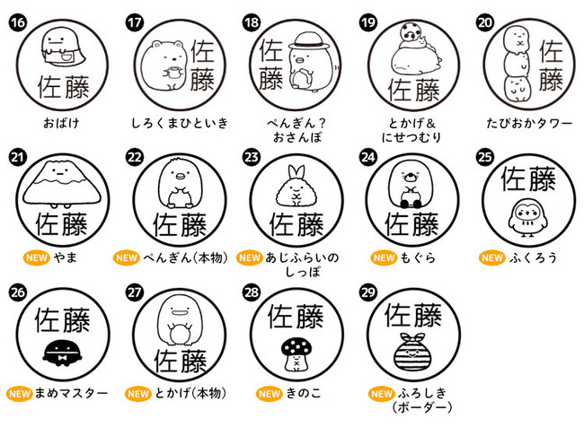 イラストはこちらの29種類。従来の20種類に、やま、ぺんぎん(本物)、あじふらいのしっぽ、もぐら、ふくろう、まめマスター、とかげ(本物)、きのこ、ふろしき(ボーダー)の9匹が追加されました。はんこの枠の中でもすみっこにいるキャラクターはどれも愛らしいものばかり。