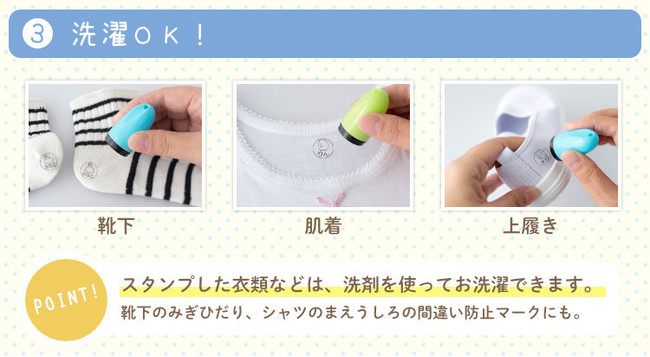 布やプラスチックなどあらゆる素材にスタンプOK。耐水性インクを使っているため、洗濯や洗い物にも落ちにくいのが特徴です。