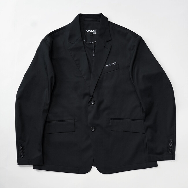 VALXの知識を詰め込み、筋トレ好きの方にフィットする仕様に仕上げました。ジャケットは肩幅と胸囲にゆとりを持たせ、体型の変化にも対応。胸ポケットのフェイクチーフや襟裏、ポケットのフラップ裏、袖口の裏地にVALXのロゴをプリントし、モチベーションを高めるデザインに仕上げました。パンツは太腿回りに余裕を持たせたイージーパンツ。絞め付け感のないワンタック入りのテーパードシルエットです。