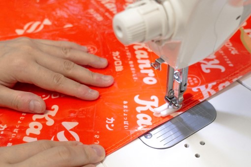 グッズのベース部分は職人が一つひとつ手作業で廃棄包材を分解し、シート状にして丁寧に縫い上げます。バッグやサコッシュは裏生地を付けてシートに厚みを持たせ、ペンケースは逆にパッケージの透かしを活かすなど、アイテムによって質感が異なる点もこだわりポイントです。さらに同じグッズでも包材のどの部分が使われるのか柄の配置が異なるため、世界でひとつだけのアップサイクルグッズとしてお手元にお届けします。
