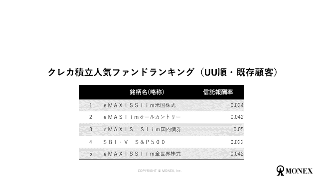 ・マネックスカードでのクレカ積立利用者の8割が1銘柄のみで申込み。(2-3)