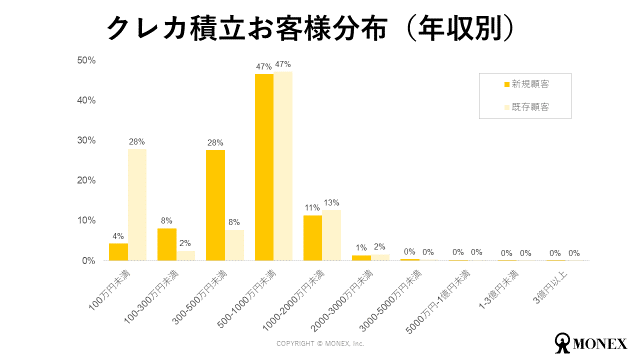 新規・既存顧客ともに年収「500-1000万未満」が5割近くに上ります。また、新規顧客では年収「500万円未満」の人が4割であり、カードのポイント還元率なども生かしながらの資産運用にマネックスカードを申込みいただいたことがうかがえます。