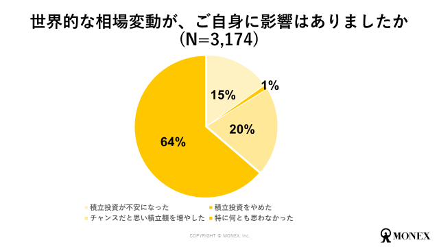 今年に入って、ウクライナ情勢やインフレ懸念で世界的に相場が大きく変動する局面がありましたが、自身の投資状況に影響がなかった人が6割以上となりました。定期的・継続的な投資は相場変動局面においても「気にしない」でいられる投資手法であることがうかがえます。次に多かったのが「チャンスだと思い積立額を増やした」という回答で、相場変動を投資のチャンスと捉える人が2割いる結果となりました。