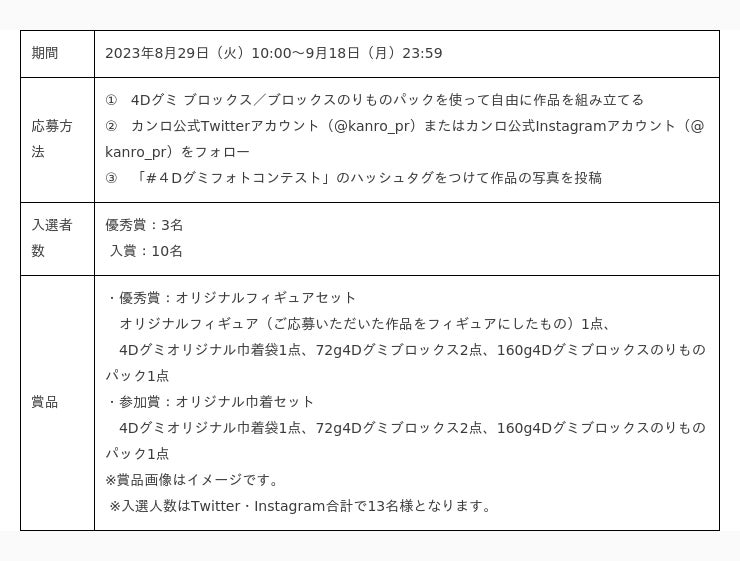 カンロ飴やピュレグミなどでおなじみのカンロ株式会社(本社:東京都新宿区、代表取締役社長 村田 哲也、以下 カンロ)は、世界中で大人気の立体型グミ「#4Dグミ ブロックス」シリーズを用いたフォトコンテストを2023年8月29日(火)より、開始いたします。