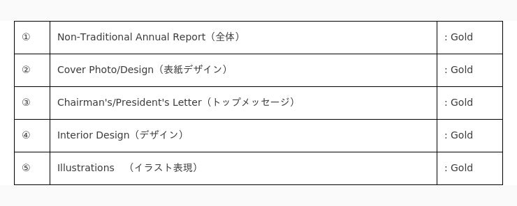 「International ARC Awards」は、米国の独立評価機関であるMerComm, Inc.が主催する世界最大規模のアニュアルレポートコンペティションで、今年で開催 37 回目を迎えています。特定の業界、広告主やスポンサーの影響を受けることなく、世界各国から、金融業界・一般企業の担当者・制作業界など幅広い分野から集められた 200名近い審査員によって、公正に評価・審査され、総合、表紙デザイン、トップメッセージ、写真、インテリアデザインなどの部門(カテゴリー)毎にGold 賞、Silver 賞、Bronze 賞、Honors 賞が選出されます。中でもGold 賞は、各評価項目の合計 100 点満点中、平均 90 点以上が必要となる難関な賞で受賞作品は全体の5%程度です。毎年世界中の企業や、NGO、政府系機関などから多くの応募があります。