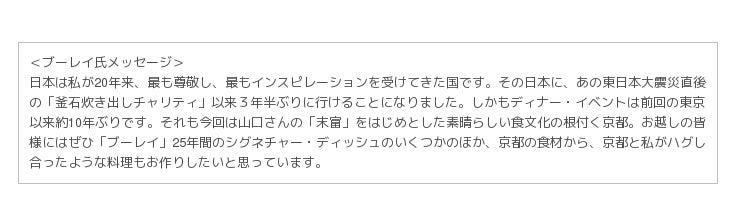 ニューヨークのレストランシーンを牽引してきスターシェフDavid Bouley(デイヴィッド・ブーレイ)氏の料理と、京都で伝統の技ともてなしの心を今に伝える菓子司「末富」4代目山口祥二氏のデザート。