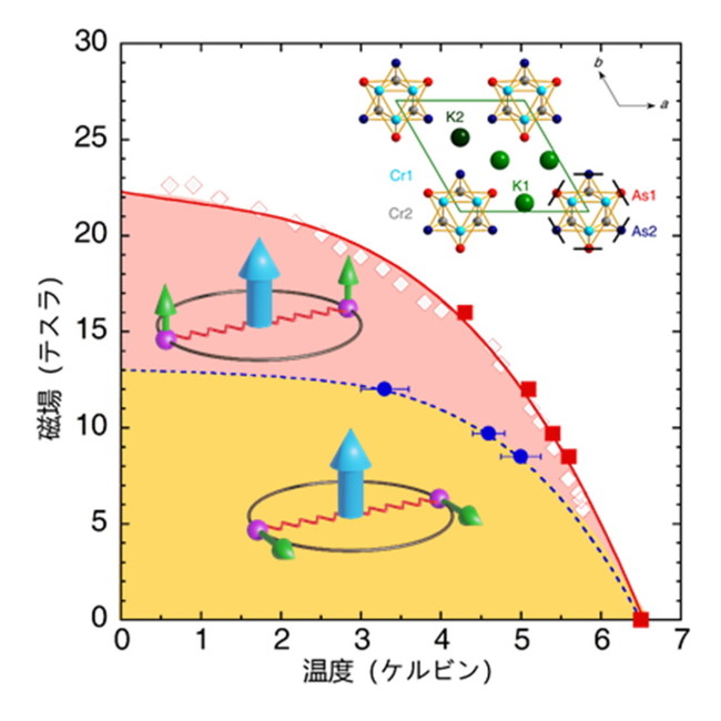 図1. K2Cr3As3の結晶構造、磁場・温度相図、および超伝導電子対のスピン配置。色塗されている領域は超伝導状態。電子はピンクの球で、二つの電子のスピンが向きを揃えている(スピン三重項状態)様子は緑の三角錐で表されています。大きい青三角錐は電子対の軌道角運動量を、波線は電子間の引力を表しています。上部臨界磁場は非常に高く、低温では20テスラを超えています。1テスラは1万ガウス。なお、地磁気は約1ガウスです。